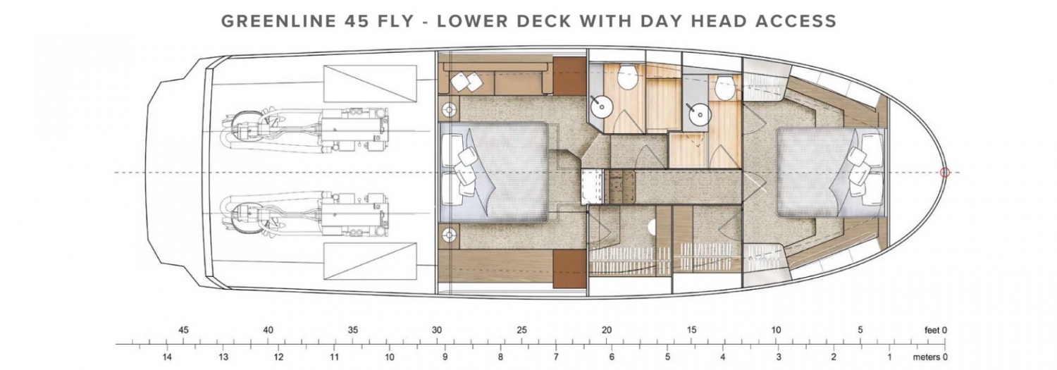 The stand out feature of the Greenline 45 is the mid-ship cabin, an island king size bed is complemented with superior full beam portholes bestowing the mid-ship cabin with magnificent views and an abundance of natural light, both to port and starboard.The outsized guest cabin is situated in the bow and fitted with a queen sized island bed. This luxurious cabin again features spectacular views and abundant natural light thanks to the cut outs in the cap rails on both sides of the hull. The level of comfort the guest cabin offers is incomparable to any other yacht in this size range